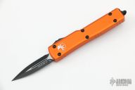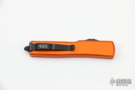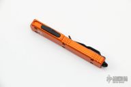 This California Legal UTX-70 features a 1.925" black double edge blade with fuller. The handle is comprised of orange anodized aluminum handle with black stainless steel hardware, thumb slide and tip down pocket clip. Dated 02/2022 with a S/N of 30968. Comes with original box. Excellent condition.