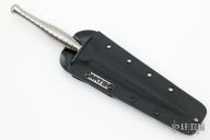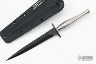 This Fairbairn Sykes Commando Dagger by Medford Knives features a black double edged blade with .251" blade stock and .895" blade depth, hidden tang construction. The handle has a black titanium guard and a satin finished turned titanium grip. Comes with a kydex sheath with TekLok. Comes with a traditional style brown leather sheath and a zippered case. Excellent condition.