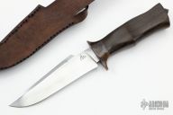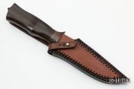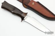 This Raptor by Murad Custom Knives features a hand rub satin finished blade with nice hamon and false top edge, .143" blade stock and 1.261" blade depth, hidden tang construction. The handle has an antiqued brass guard and a Japanese Rosewood grip. Comes with a brown leather sheath and COA. New from maker.  This knife is a take down model and by removing the tang nut you can remove the handle.