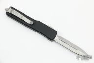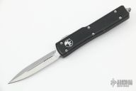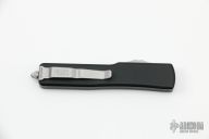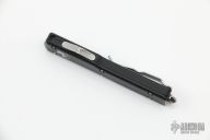 This UTX-70 OTF automatic by Microtech features a stonewash finished blade with a standard edges. The handle has a black aluminum frame with blasted stainless steel tip down clip. Serial number 22896 and dated 03/2021. Comes with original box and papers. Has some light scuffs and a couple spots on the edges of the frame where the black is worn off, otherwise good condition. Blade looks unused.