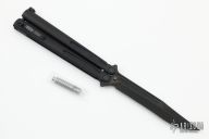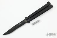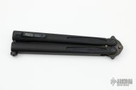 This Tachyon III balisong by Microtech Knives has a DLC finished blade with false top edge. The handles are integral black aluminum with spring latch and tip up stainless steel clip, all black hardware. Includes original box and papers. Dated 09/2016. Comes with take down tool. Has some light scratches on the latch, and some scuffs on the blade. Great condition otherwise.