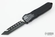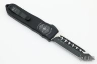 The Recon-Elite Double-Action Automatic has an overall length of 9.75” and a closed length of 5.625"". The 4.1" fine edge, Tanto-point blade is made of all Black finished ELMAX stainless steel. The dual, ventilated blood grooves on the blade allow for lightning fast deployment. The Black Type lll Hardcoat Anodized Aluminum handle is has top and bottom jimping for a non-slip grip. The black thumb slide rides on a stainless steel plate with ceramic balls to reduce friction. It features all black hardware with a black, serial numbered, reversible for right, or left hand pocket clip for tip-down carry. It also has a lanyard hole and hardened glass breaker tip.