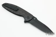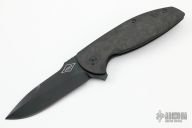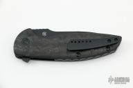 This Turbo is a Peter Carey design by Monterey Bay Knives. It features a black drop point blade with swedge, notched thumbrest and flipper. The handle has rain drop carbon fiber scales, and inset lock, black tip up clip, and dragon spine backspacer.  Rides on bearings. Nice detent, lockup and blade seating. Comes with original zipper case and extra hardware. Has a couple light scuffs and scratches, otherwise excellent condition.