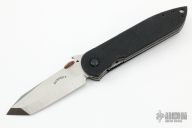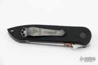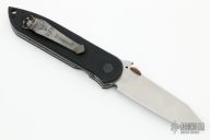 This Suspect 6 by Ernie Emerson features a chisel ground tanto blade with stonewashed flats, copper thumbdisc, wave feature and notched thumbrest. Rides on bearings, nice detent, lockup and blade seating. The handle has black G-10 scales, tumbled titanium liners, black stainless steel clip reading "USN Suspect". Comes with original box and papers. Excellent condition.