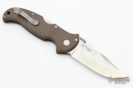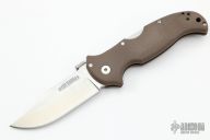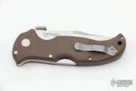 The Bush Ranger by Cold Steel, features a satin finished clip point blade. The handle has a brown G10 frame with a stainless steel backspacker and tip up pocket clip. Includes the original box. Excellent Condition.