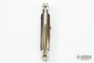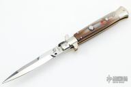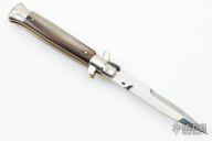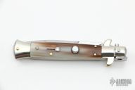This auto by Latama features a spear point blade with a false top edge. Nickle silver guard and rear bolster and buffalo horn scales. Nice function, strong firing and lock up. Excellent Condition.