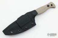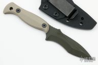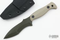 This Extremis MK1 by Half Face Blades features a green blade with a notched thumbrest, .144" blade stock, .994" blade depth, full tang construction. The handle has tan G-10 scales. Comes with a kydex sheath with clip. New Condition.