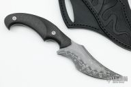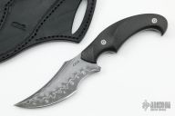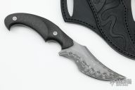 This Snake from the Sobral Brothers features their San Mai steel that has been forged into a beautiful finished product. Has a clip point recurve blade with a false top edge, .167" blade stock and 1.564" blade depth, full tapered tang construction. The handle features carbon fiber scales with stainless steel pins that have been laser engraved. Comes with a hand tooled black leather sheath and a leather zippered case. New from maker.