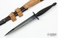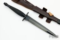 This Fairbairn Sykes Fighting Knife by HG Long & Co features a black double edged blade with .155" blade stock and .858" blade depth, hidden tang construction with black steel handle and fittings. Comes with a brown leather sheath. Excellent condition.