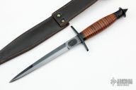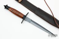 This is a copy of the famous Case V42 dagger made for the First Special Service Force [ FSSF ] the famous " Devil's Brigade " during World War Two. It is made by H.G. Long & Co. of Sheffield, England and sold by the EK Commando Knife Company. Has a black double edged blade with .181" blade stock and .742" blade depth, hidden tang construction. The handle has a black guard and butt with stacked leather and brass grip. Comes with original brown leather sheath. Excellent condition.