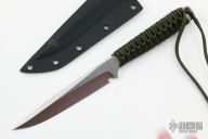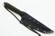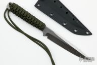 This knife by Mick Strider features a satin finished blade with green paracord wrap, .222" blade stock and .885" blade depth, full tang construction. Comes with kydex sheath. New condition.