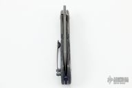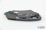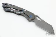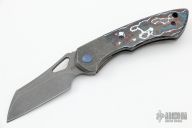 This Whippersnapper Bolsterlock from Olamic Cutlery features an acid washed blade, thumbhole, notched thumbrest and front flipper. The handle has an acid tumbled titanium frame with fat carbon scales, pocket clip is positioned for tip up carry, floating anodized titanium backspacer. Blade is centered when closed and locks up with no play. Comes with maker's card with a serial number of WSBL022-W and dated 06/17/2022. Includes a padded zippered case. Excellent condition.