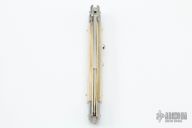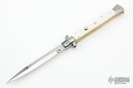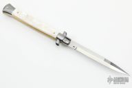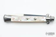 This 11" Picklock by Frank Beltrame features a polished bayonet ground blade with false top edge. The handle has stainless steel bolsters, front and rear, mother of pearl scales, brass liners, stainless spring. Excellent condition.