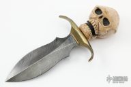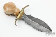 This Push Dagger by Ed Halligan features a double edged Damascus blade with .166" blade stock and 1.327" blade depth, hidden tang construction. The handle has a brass guard and a skull carved femur bone grip. Excellent condition.