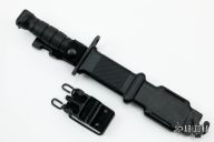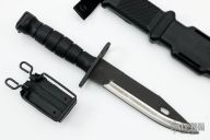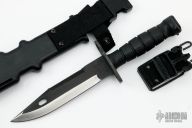 The M9 Bayonet by Ontario Knife Company was reground by Borka Blades. It has a black blade with satin grinds, sawteeth on the spine and hole in the blade that corresponds with the tab on the sheath to act as a wire cutter, .231" blade stock and 1.39" blade depth, hidden tang construction. The handle has a steel guard and butt with black nylon grip. Comes with original sheath. Has some light scuffs, but that's the way the came to Borka when he reground them. Excellent condition.
