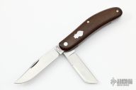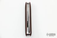 This slipjoint by Esnyx Custom Knives features two satin finished blade both with single nail nicks. The handle has micarta covers with a stainless steel escutcheon, red G-10 liners, stainless steel liners and spring. Has a half-stop, flush in all positions. Comes with original box.  Excellent Condition.