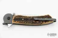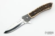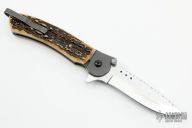 This flipper by John Kubasek features a hand rub satin finished drop point blade with fileworked spine, notched thumbrest, knurled thumbstuds, and flipper. The handle has a bead blasted titanium frame with imitation stag scales, bead blasted titanium tip up clip, black G-10 backspacer. Nice detent, lockup, action and blade seating. Comes with a zippered case. Has some scuffs and scratches, good condition.