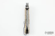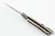 "I've been a part time knifemaker since 1988. I became a member of the Knifemaker's Guild in 1999. I am also a member of the Northeast Cutlery Collectors Association (NCCA). I specialize in linerlock folders. The frames are made from 6AL4V titanium. For overlay handle material I have used just about everything from exotic woods, pearl, ivory, G-10 and Micarta. The blades, which I feel is the most important part of the knife, I try and use the best steel available. For my stainless steel blades I use ATS-34, BG42 and I am starting to use S30V, professionally heat treated to 59-60Rc. I use some carbon steel damascus by George Werth however for everyday carry knives I use more stainless damascus. My preference is Damasteel which is produced in Sweden and sold by Michael Walker. I've also used steel by Devin Thomas and Mike Norris. Most of my knives are made in 3" and 4" blade lengths in both right and left hand models. I also have a couple of new patterns available made with a patented "Rip Cord" mechanism. It is an out the front mechanical knife that has a metal strip that extracts the blade from the handle with a tug. The metal strip also called the 'key' can be reinserted into the knife to unlock the blade and let it retract back into the handle."