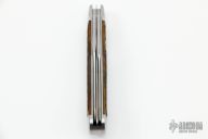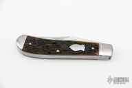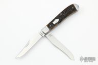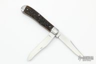This Two-Blade Trapper by Shigeru Tozaki features hand rubbed satin finish blades with nail nicks. The handle has stainless steel liners with satin finish integral double bolsters, and jigged bone covers, stainless steel escutcheon. Half stops in all positions.  Includes a padded zippered case.  Excellent Condition.