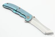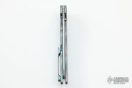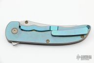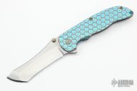 This Norseman (#1814) by John Grimsmo features a tumbled blade with a single anodized titanium thumb stud, notched thumb ramp and flipper. Stonewashed and anodized titanium frame with a honeycomb pattern front scale and titanium screws. Matching tip up pocket clip.  Very smooth action that requires no wrist movement. Nice detent, lockup and blade seating. Rides on ceramic bearings. Knife is in excellent condition, shows no signs of use or carry.