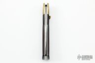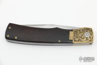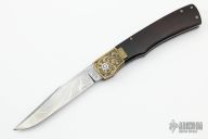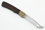 This auto by John Hoskins features a clip Damascus blade with false top edge. The handle has dovetailed and engraved brass bolsters and button, ironwood scales, stainless steel liners and a Damascus backspacer. Nice lockup and action. Has a few light scratches, otherwise excellent condition. Comes with a zippered case. Engraved by Sherwood