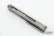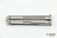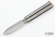 The SPD Invictus Bali-Ti is a utility butterfly knife, featuring titanium billet handles, a Böhler M390 blade, bronze bushing pivot, and a titanium spring latch. Additional details include jimping on the ears and back spacers, and a billet titanium pocket clip. Comes with zippered case. Excellent condition.