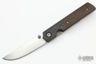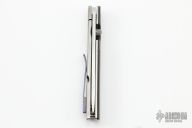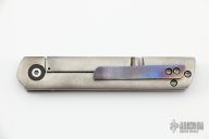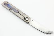 This Framelock by Old Dominion Knifeworks features a hand rub satin finished blade with a single checkered thumbstud. The handle has an orange peel finished titanium frame with a lightning strike carbon fiber bolster, green linen micarta scale, and an anodized and orange peel finished titanium tip up pocket clip. Rides on bearings, nice detent, lockup and blade seating. Has a few light scratches and a couple small nicks in the blade edge, otherwise good condition.