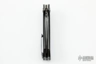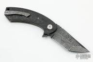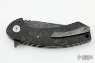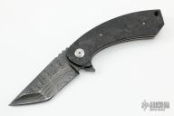 This Nasty Boy Flipper from Melvin Lozada features a Damascus blade with compound grind, notched thumbrest and flipper. The handle is comprised of marble carbon fiber scales, titanium liners, carbon fiber backspace, lanyard hole in pommel, Damascus tip up pocket clip. Rides on bearings, nice detent, lockup and blade seating. Has some light scuffs, otherwise excellent condition.