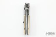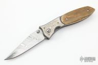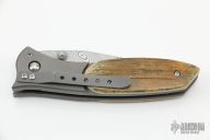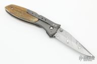 This Howler by Tom Anderson features a Damascus blade with dual thumbstuds. The handle has a bead blasted titanium bolsters, one of which has been engraved and gold inlaid by RD Nott, mammoth ivory scales, bead blasted titanium liners and tip down clip. Excellent fit and finish. Nice detent and blade seating. Has a few light scuffs and a little vertical blade play, otherwise excellent condition.