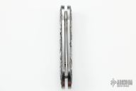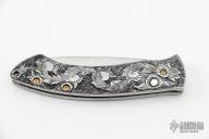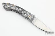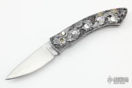 This Custom Auto by Adams International Knife works features a hand rub satin finished blade. The handle has an engraved stainless steel frame with mother of pearl button and gold plated screws. Has some light scratches and a couple of very small dings on the edges of the frame. Nice action, has a little blade play, otherwise good condition.