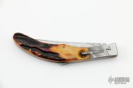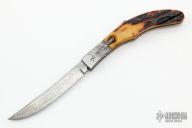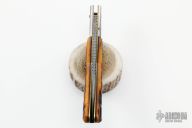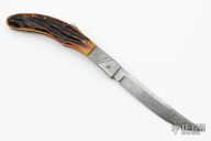 This auto by Robert Rebbec features a Damascus blade with fileworked spine. The handle has fileworked steel bolsters and rocker bar, stag scales, brass liners, steel backspacer/lockbar. Nice action, lockup and blade seating. Has some light scuffs/scratches, otherwise good condition. Robert Rebbec said that this is the first knife he ever sold.