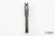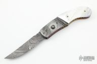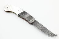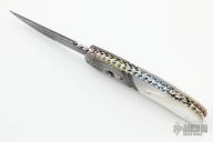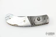 This Auto is marked "JE", please let us know if you know who this maker is. It features a Damascus blade with fileworked spine. The handle has fluted Damascus bolsters, Damascus button with gold pin, mother of pearl scales, fileworked and anodized titanium liners, fileworked stainless steel backspacer. Nice action, blade seating and lockup. Excellent condition.