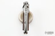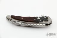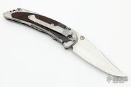 This D/A linerlock Auto by Brad Fairall features a satin finished blade with notched thumbrest and a mother of pearl inlaid thumbstud. The handle has carbon fiber bolsters, desert ironwood burl scales, satin titanium liners with milled and orange peel finished edges, milled stainless steel backspacer with fileworked inside, tip down titanium clip. Nice detent, lockup, action and blade seating. Has a few light scratches, otherwise excellent condition.