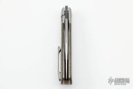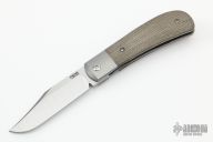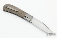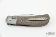 This Lanny's Clip Front Flipper by Enrique Pena features a satin finished blade with a front flipper and notched thumbrest. The handle has titanium bolsters, green canvas micarta scales with a copper backspacer and titanium tip up pocket clip. Includes a Pena X-Series padded box. Excellent Condition.