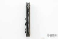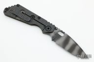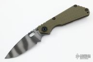 This SNG framelock folder by Mick Strider features a tiger striped blade and a dimple pattern green G-10 and flamed titanium frame and tip up titanium clip. Includes a "Lock Bar Stabilizer" for maximum reverse lock retention. Nice detent, lockup and blade seating. Excellent condition.