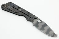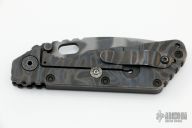 This SMF framelock folder by Strider features a tiger stripe blade and a black G-10 flamed titanium frame and tip up titanium clip. Includes a Hinderer "Lock Bar Stabilizer" for maximum reverse lock retention. Nice detent, lockup and blade seating. Has a few scuffs and scratches, otherwise excellent condition.