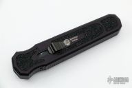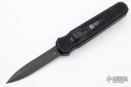 This Harkins Triton OTF Auto has a black double-edged blade. The handle is black anodized aluminum with non-slip inserts and matte black finished tip down clip. Comes with nylon belt pouch. Excellent condition.