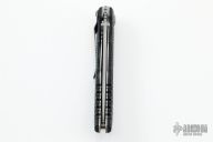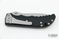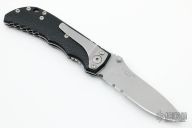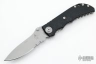 This D2 Harsey Linerlock D/A has a bead blasted, flat ground CPM-S30V spear point blade with partially serrated edge, dual thumb studs and notched thumbrest. Handle is non-slip polymer over stainless steel liners, lanyard hole, and bead blasted stainless steel tip down clip. Excellent condition. Very comfortable knife in the hand. Comes with original box and papers. Hard to find piece. Comes with instruction for the auto feature, it has a hidden button under the scale.