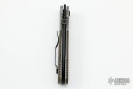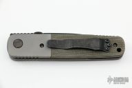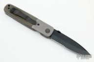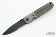 This Po-Boy A-100 from Emerson Knives features a black partially serrated blade with swedge, thumbdisc and notched thumbrest. The handle is comprised of bead blasted and dovetailed titanium bolsters and green canvas micarta scales over bead blasted titanium liners and black G-10 backspacer, stainless steel pocket clip is positioned for tip up carry. Excellent condition.  Comes with original black G-10 scales.