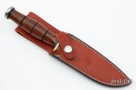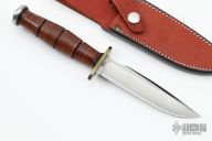This knife by Al Mar features a satin finished blade with .148" blade stock and 1.066" blade depth, hidden tang construction. The handle has a brass guard, stainless steel butt, stacked leather handle. Comes with a brown leather sheath and original box. Excellent condition.
