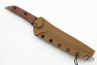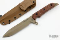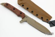Given that the knife will likely be used as a utility tool more often than not, there are features that were included to facilitate that use. The comfortable Micarta handle scales will stand up to use and provide excellent grip. There is a choil so you can choke up for finer tasks, and it’s made from 1095 steel, which holds a great edge, and is easy to re-sharpen in the field (a must for those who don’t always have a proper sharpening system handy). It comes with a tan Kydex sheath that has great retention, but still allows for a solid grip from the moment it’s drawn.