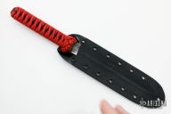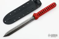 This Dagger by Ecos Knives features a hand forged and acid etched double edged blade with .167" blade stock and .875" blade depth, hidden tang construction. The handle has a red cord wrap over black silk cord. Comes with a kydex sheath, but part of the top of it is broken off. Has some sheath marks on the blade, otherwise excellent condition.