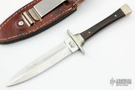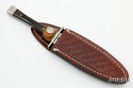 This Boot Knife by Case Knives features a double edged satin finished spear point blade. The handle is comprised of a nickel silver guard and pommel with wood scales over full tang construction. Includes brown leather hand tooled boot sheath with clip. Has some scratches, otherwise good condition.