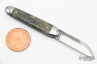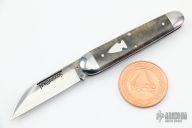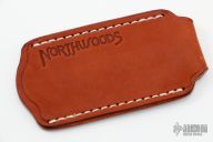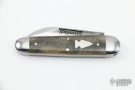 This Northwoods Knives Fremont Jack features a wharncliffe style blade with swedge and long pull. The handle is comprised stainless steel bolsters, camel bone covers over stainless steel liners and spring, nickel silver escutcheon. Includes leather sheath and a copper challenge coin. Excellent condition.