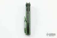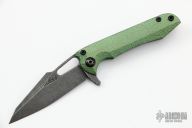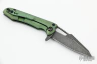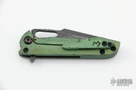 This Micro Mako by Gavko Knives features a dark tumble finished blade with thumbhole and flipper. The handle has a textured and anodized titanium frame with matching tip up clip and backspacer, black screws and pivot. Comes with a zippered case. Nice detent, lockup and blade seating. Excellent condition.