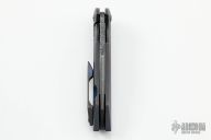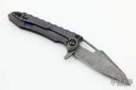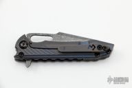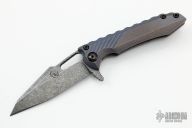 This Micro Mako by Gavko Knives features a dark tumble finished blade with thumbhole and flipper. The handle has a milled and anodized titanium frame with matching tip up clip and backspacer, black screws and pivot. Comes with a zippered case. Nice detent, lockup and blade seating. Excellent condition.