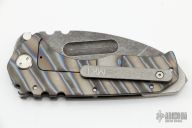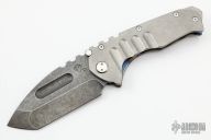 This Praetorian T from Medford Knife and Tool features a dark tumble finished tanto blade with notched thumbrest and fullers. The frame is comprised of a tumbled titanium frame with titanium tip up pocket clip, steel backspacer doubles as a glass breaker. Comes with a original box, case and papers. Excellent condition.