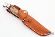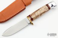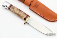 This knife features a satin finished drop point blade, .123" blade stock and .975" blade depth, hidden tang construction. The handle has a brass guard, aluminum butt, burl wood handle with black/red/brass/wood spacers. Comes with a brown leather sheath and the original box.  Excellent Condition.
