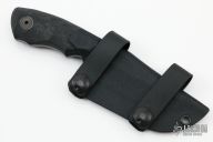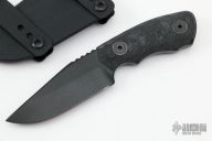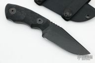 This fixed blade by Bill Coye features a black blade with notched thumbrest, blade thickness of .208" and blade depth of 1.286", full tang construction. Great feel in the hand. Handle has sculpted black G-10 scales. Comes with kydex sheath. Comes with original papers and COA. Excellent condition.