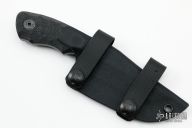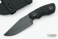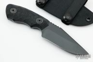 This fixed blade by Bill Coye features a dark gray blade with notched thumbrest, blade thickness of .208" and blade depth of 1.292", full tang construction. Great feel in the hand. Handle has sculpted black G-10 scales. Comes with kydex sheath. Comes with original papers and COA. Excellent condition.